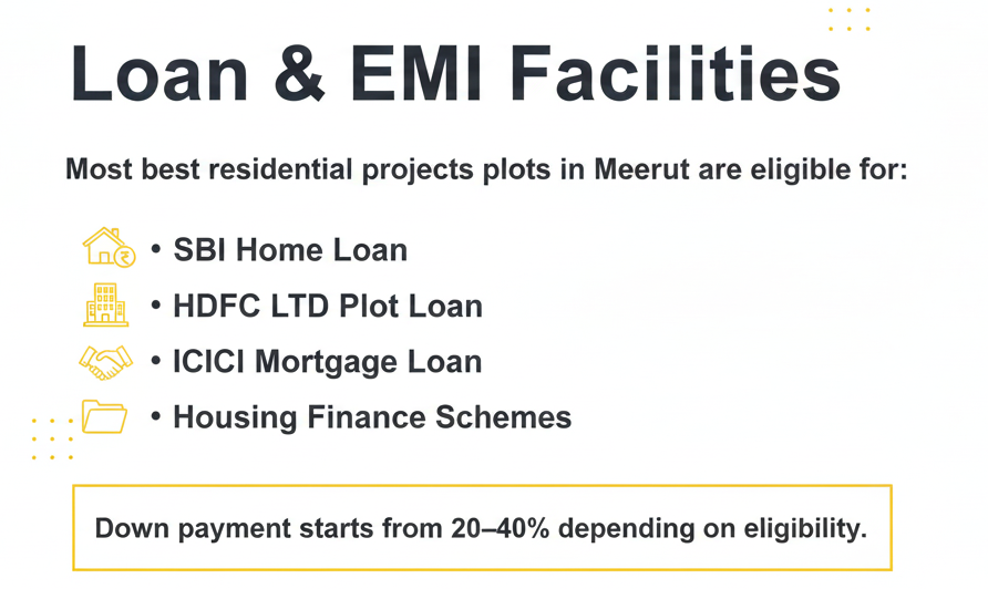 Loan eligibility depends on income, plot size, and approval category. Down payments generally range from 20–30% of the total value.